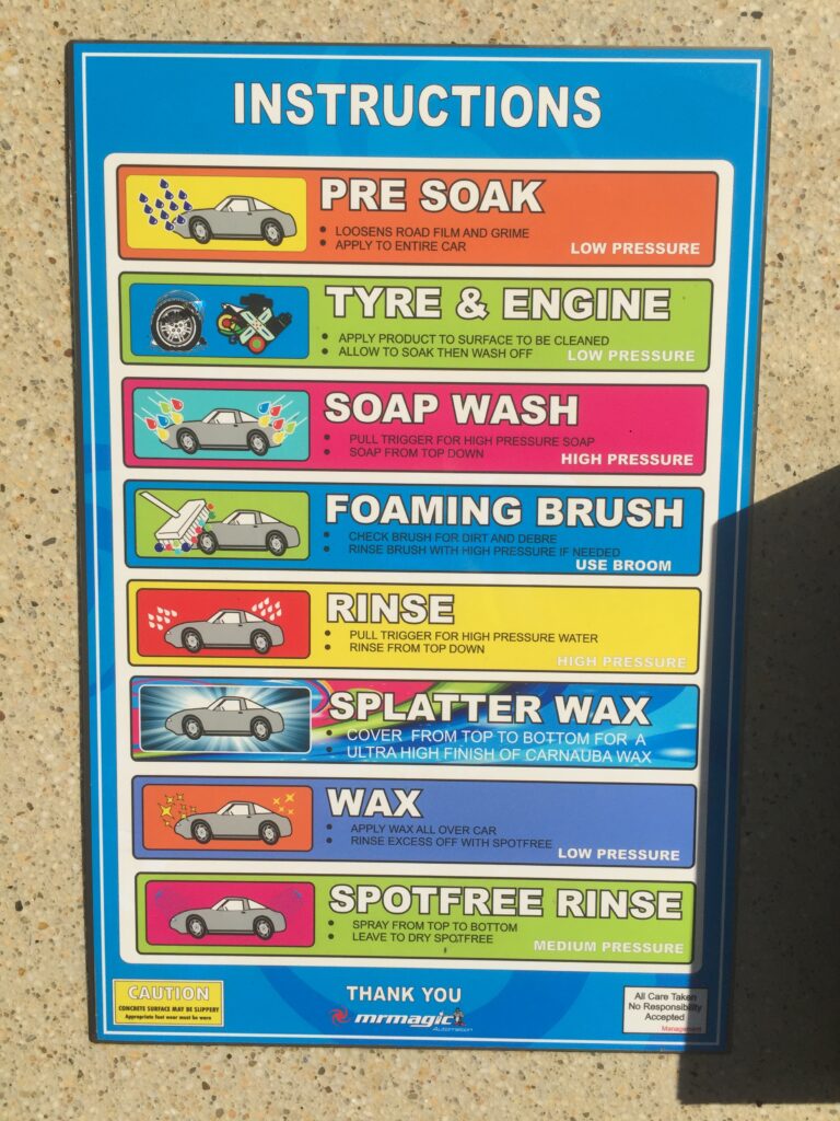 Most of the steps will use the high/low pressure wash down gun located closest to the bay timer where you make payment. The foaming brush option will utlise a steam of foaming soap out of the foaming brush located on the opposite side of the bay. And the splatter wax option will splatter a Carnauba wax out of a specially designed splatter wax gun on a coiled hose which is located next to the high pressure gun. All pieces of equipment are clearly labeled to help any confusion.
